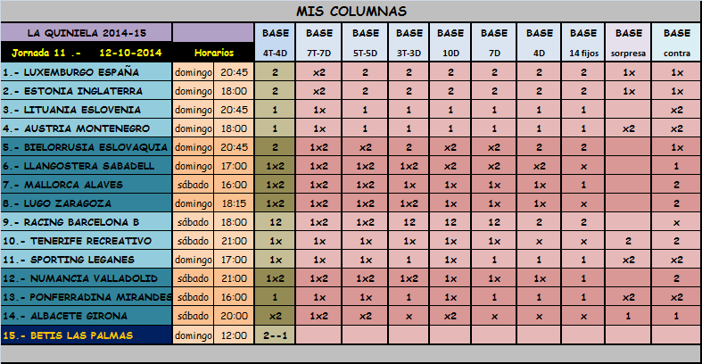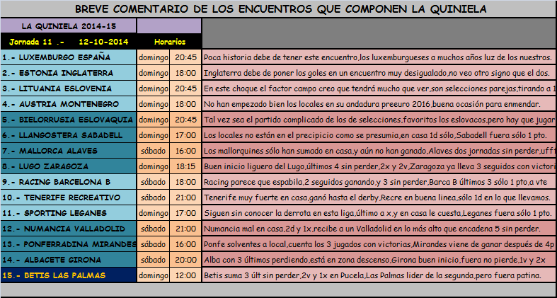 QUINIELA JORNADA 11 Y QUINIGOL JORNADA 12 (JUEVES 9),SÁBADO Y DOMINGO 11 Y 12 OCTUBRE 2014.