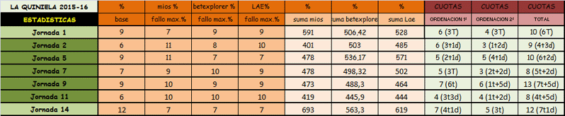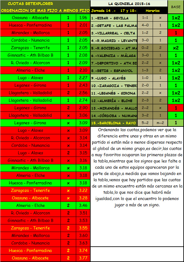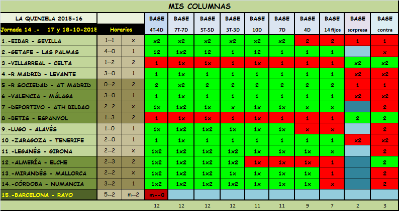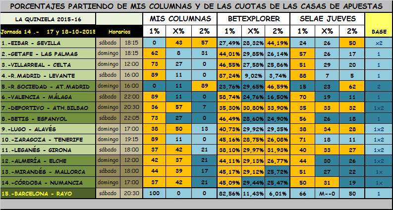 QUINIELA JORNADA 14,SABADO Y DOMINGO 17 Y 18 OCTUBRE 2015.