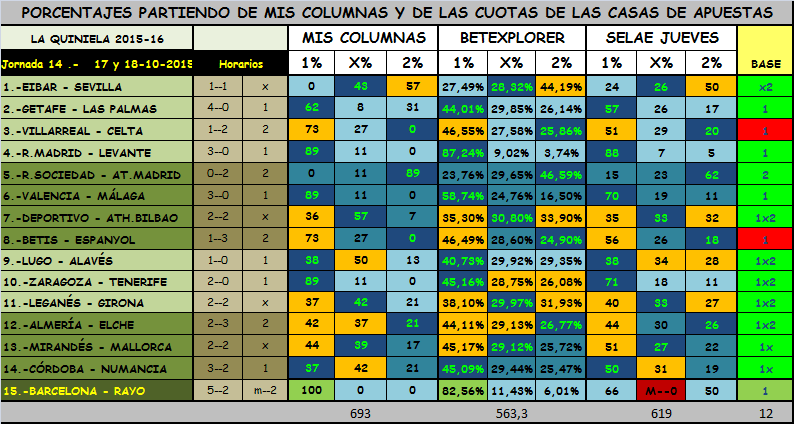 RESULTADOS QUINIELA JORNADA 14, DOMINGO 18 OCTUBRE 2015.
