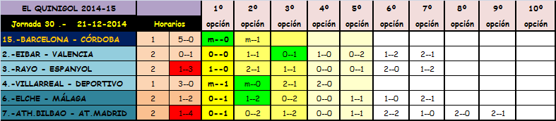 QUINIELA JORNADA 27 Y QUINIGOL JORNADA 30,SABADO Y DOMINGO 20 Y 21 DICIEMBRE 2014.