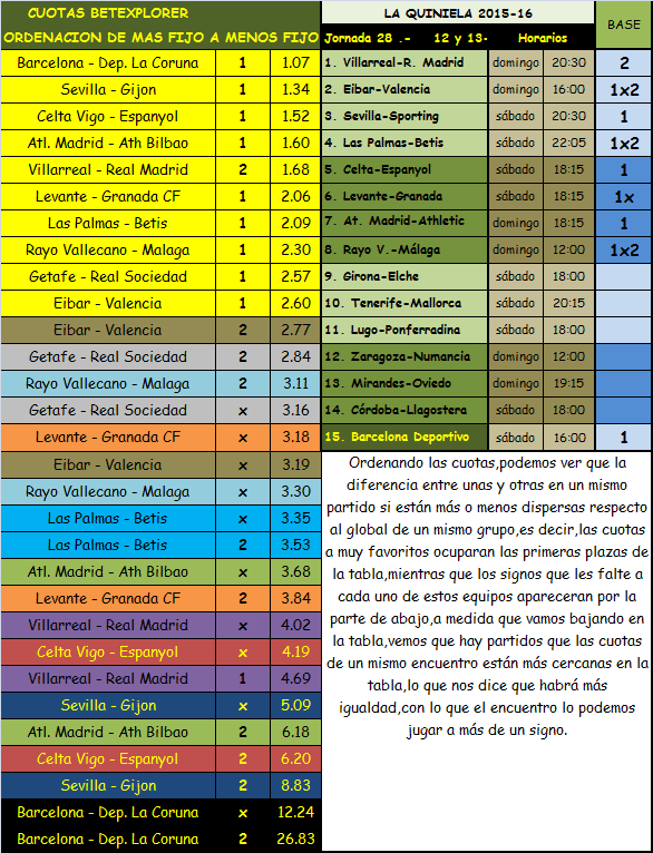 QUINIELA JORNADA 28,SABADO Y DOMINGO 12 Y 13 DICIEMBRE 2015.