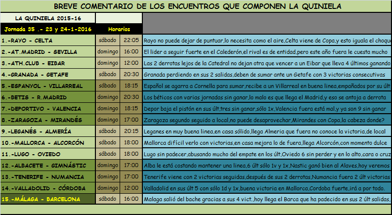 QUINIELA JORNADA 35,SABADO Y DOMINGO 23 Y 24 ENERO 2016.