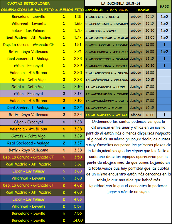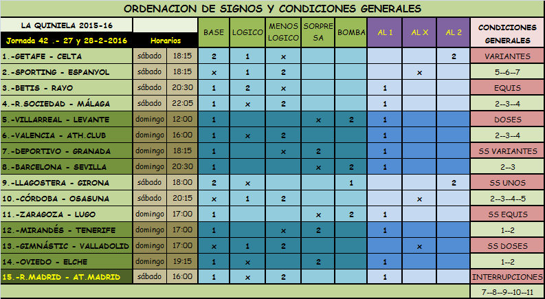 QUINIELA JORNADA 42, SABADO Y DOMINGO 27 Y 28 FEBRERO 2016.