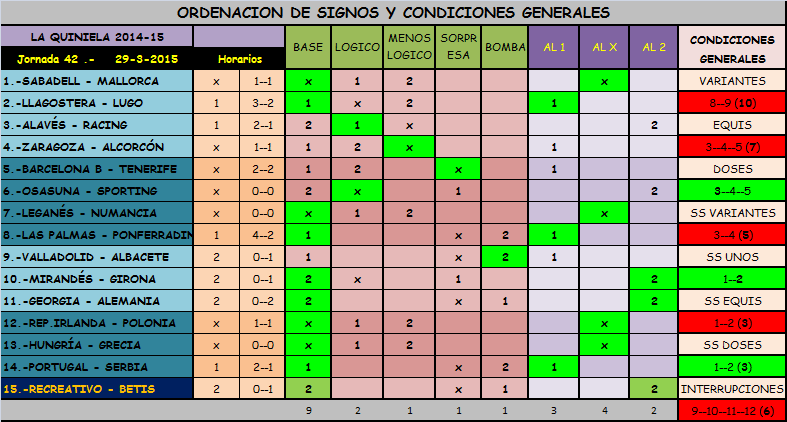 QUINIELA JORNADA 42 Y QUINIGOL JORNADA 48 Y 49,VIERNES,SABADO Y DOMINGO 27-28 Y 29 MARZO 2015.