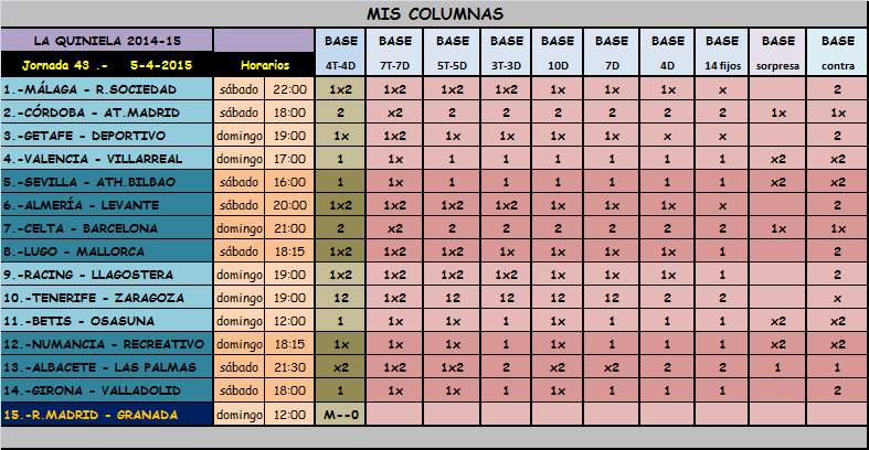 QUINIELA JORNADA 43 Y QUINIGOL JORNADA 50,SABADO Y DOMINGO 4 Y 5 ABRIL 2015.