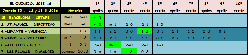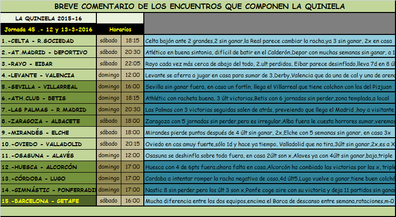 QUINIELA JORNADA 45, SABADO Y DOMINGO 12 Y 13 MARZO 2016.