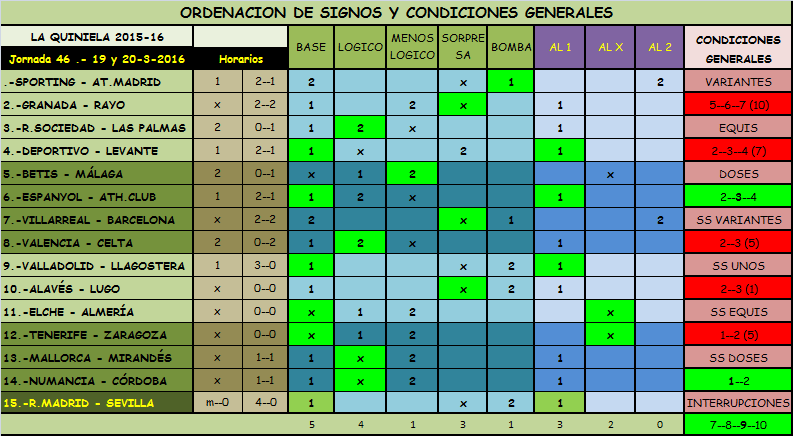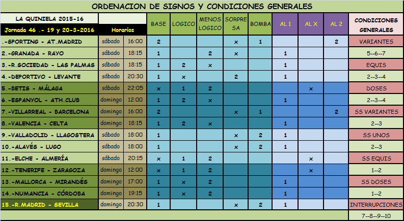 QUINIELA JORNADA 46, SABADO Y DOMINGO 19 Y 20 MARZO 2016.
