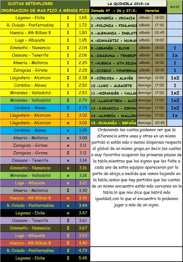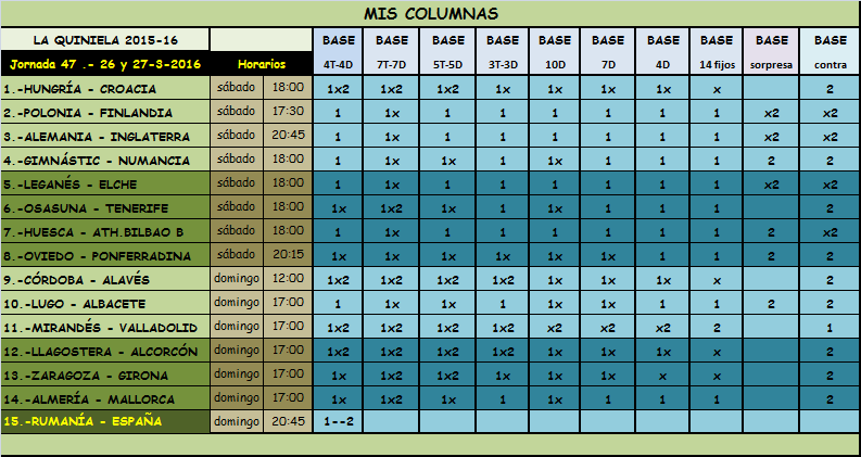 QUINIELA JORNADA 47, SABADO Y DOMINGO 26 Y 27 MARZO 2016.
