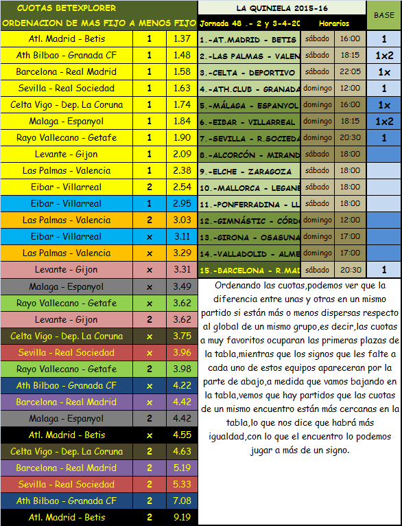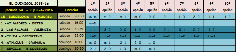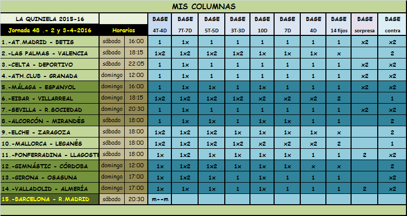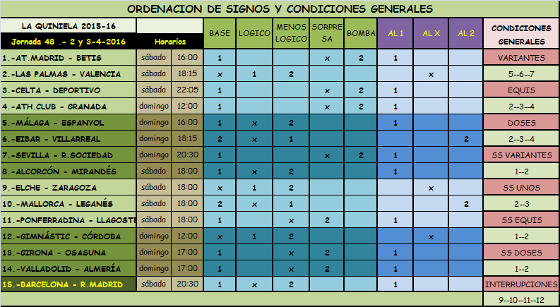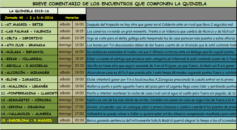 QUINIELA JORNADA 48, SABADO Y DOMINGO 2 Y 3 ABRIL 2016.