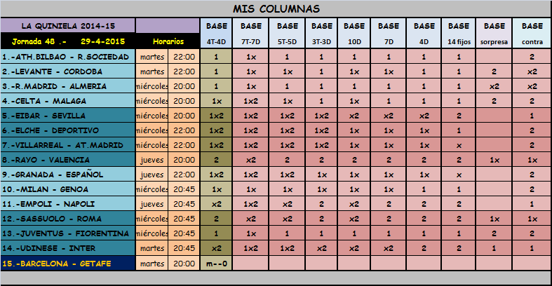 QUINIELA JORNADA 48 Y QUINIGOL JORNADA 57,MARTES,MIERCOLES,JUEVES 28-29-30 ABRIL 2015.