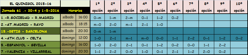 QUINIELA JORNADA 53, SABADO Y DOMINGO 30-4 Y 1-5-2016.