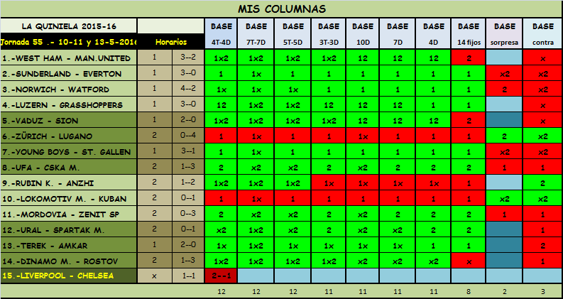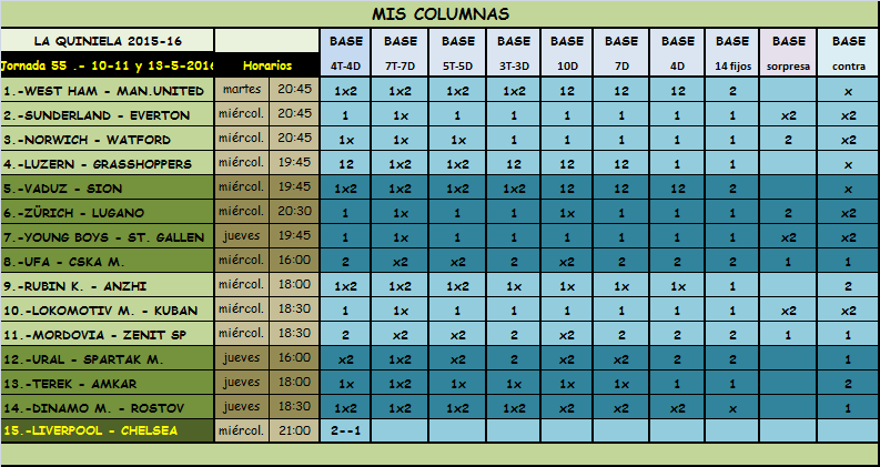 RESULTADOS QUINIELA JORNADA 55, MARTES, MIERCOLES Y JUEVES 10-11-12 MAYO 2016: