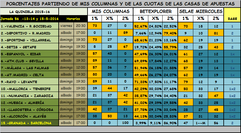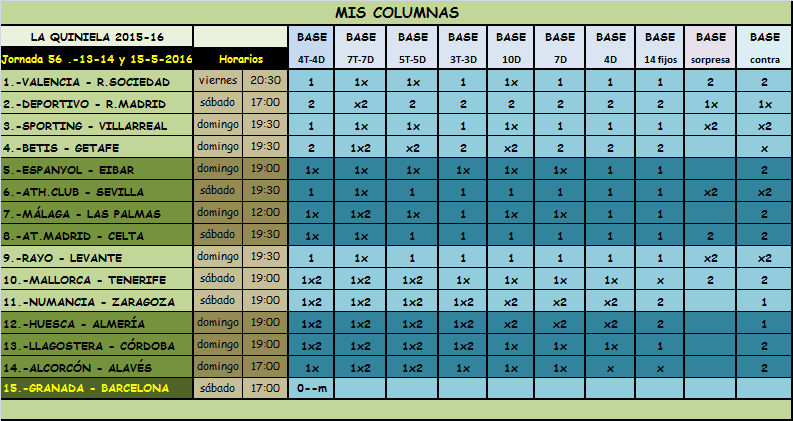QUINIELA JORNADA 56, VIERNES, SABADO Y DOMINGO 13-14-15 MAYO 2016.