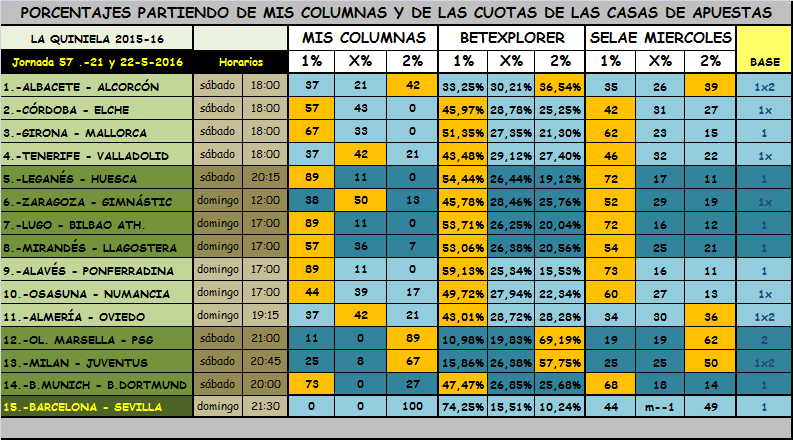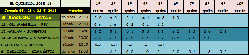 QUINIELA JORNADA 57, SABADO Y DOMINGO 21 Y 22 MAYO 2016.