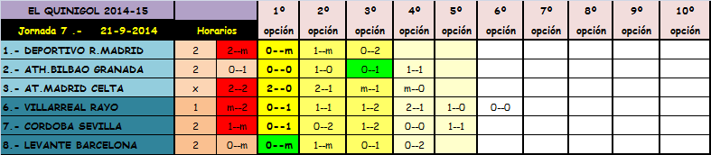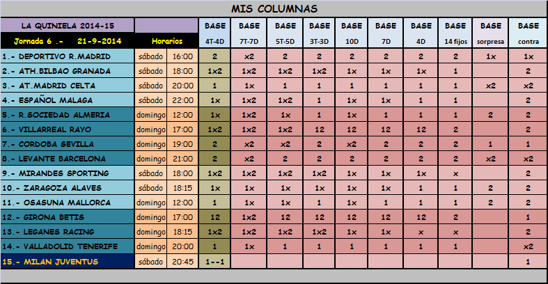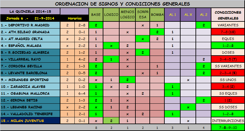 La segunda tabla,intento ordenar cada uno de los tres signos de cada partido en cinco columnas,poniendo el signo más claro de cada partido en la columna de Base,luego en lógico,menos lógico,sorpresa y bomba.
