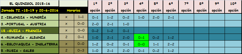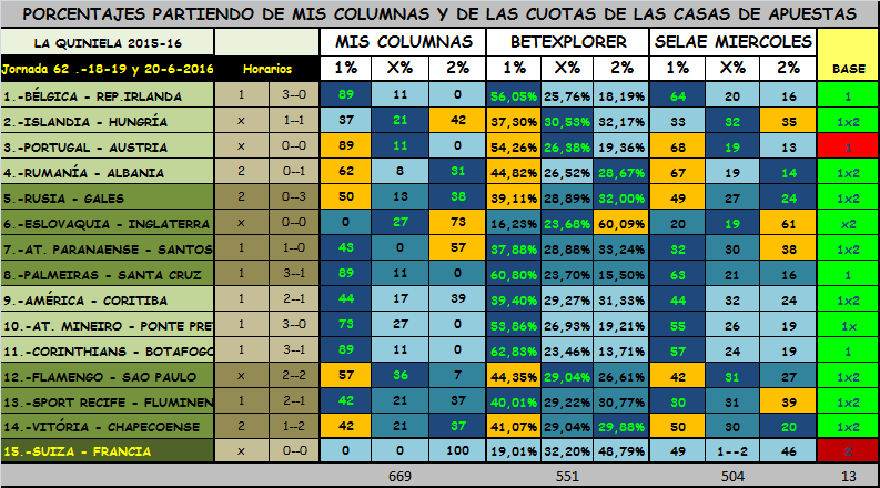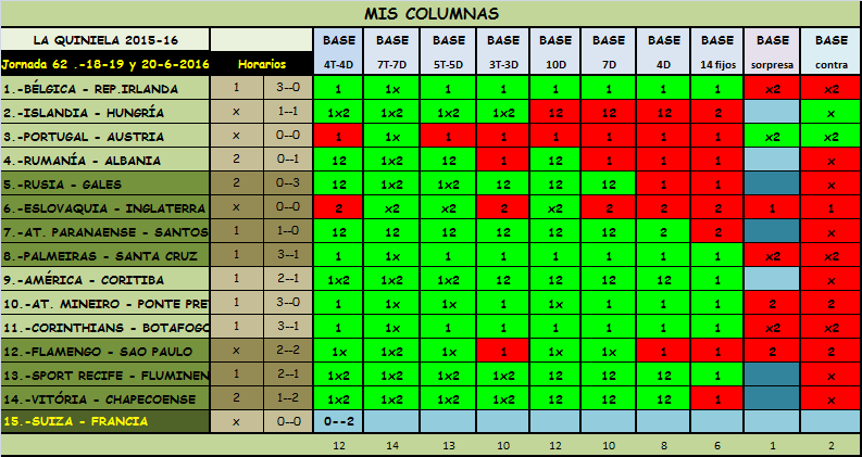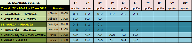 QUINIELA JORNADA 62, SABADO, DOMINGO Y LUNES, 18-19-20 JUNIO 2016.