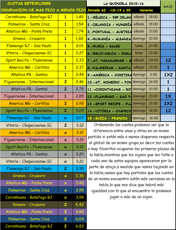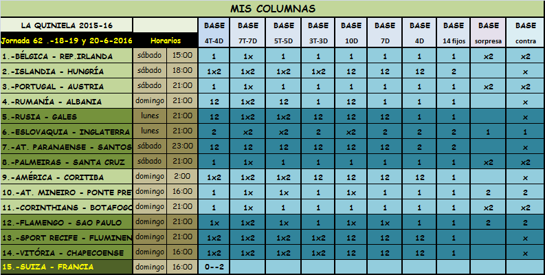 ; QUINIELA JORNADA 62, SABADO, DOMINGO Y LUNES, 18-19-20 JUNIO 2016. Skip to main content