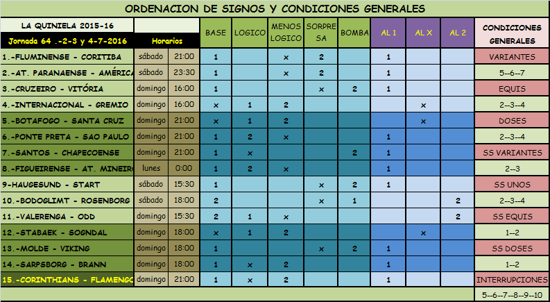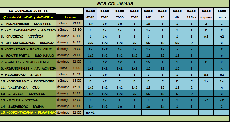 QUINIELA JORNADA 64, SABADO, DOMINGO Y LUNES, 2-3-4 JULIO 2016.