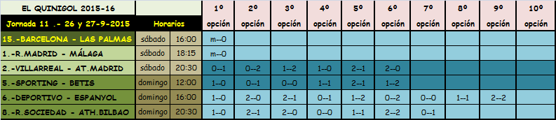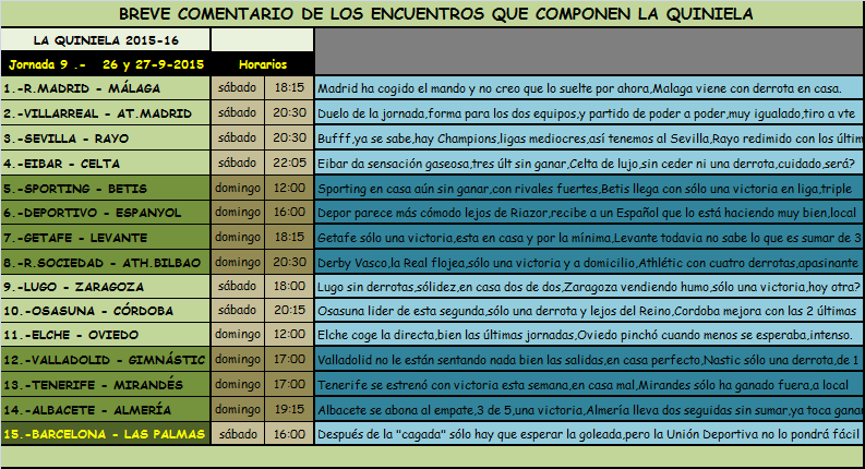 QUINIELA JORNADA 9,SABADO Y DOMINGO 26 Y 27 SEPTIEMBRE 2015.