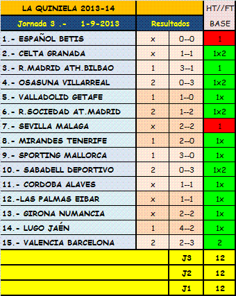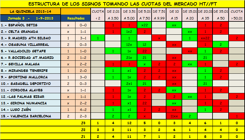 Aquí estaría la base de la quiniela tomando el mercado HT//FT,yo sobre todo discrepo del partido entre el Español y el Betis,y el Sevilla y el Malaga en lo que se trata de los partidos de primera,en los de segunda,tan sólo en el Sporting y el Mallorca,cada uno,que lo analice como mejor le interese.