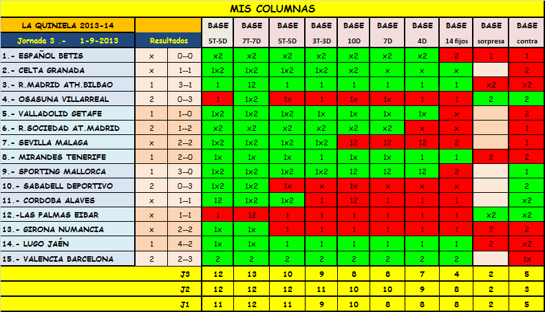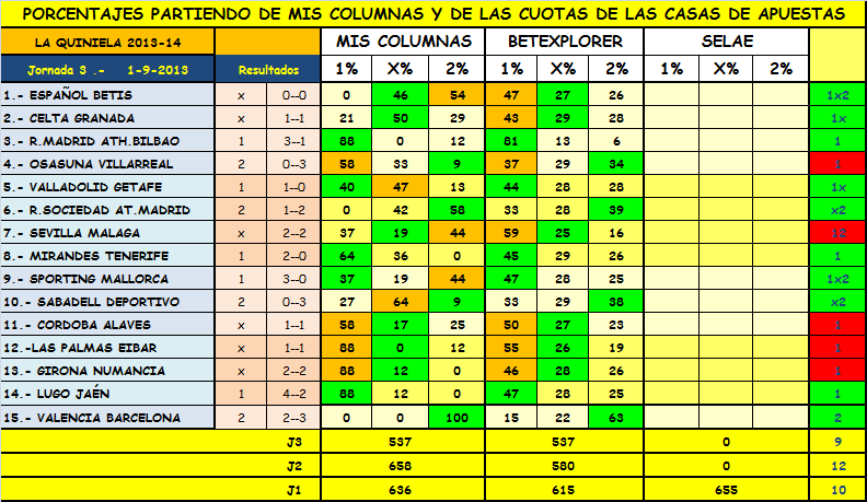 Como podeis ver en la imagen,tan sólo el Madrid se queda en la primera columna,recordar que por ahora llevamos cinco de cinco,y aumenta considerablemente,hasta 10 partidos que tienen su primer signo en la segunda columna,cuando creo que el que más de las dos habian sido seis o siete partidos,pero,donde mejor se refleja la igualdad es en el tercer tramo,donde en la mayoría de encuentros encontramos dos o incluso los tres signos,lo que hace que nos salga una quiniela super interesante.