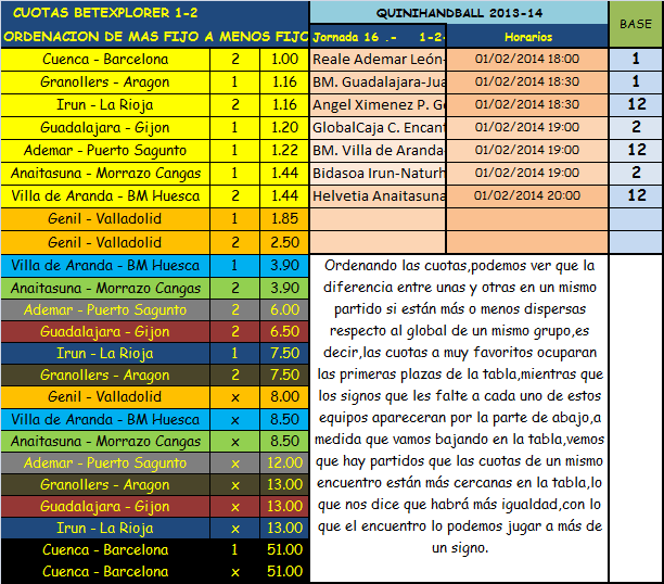 Información QUINIHANDBALL jornada 16,sábado 1 Febrero 2014.
