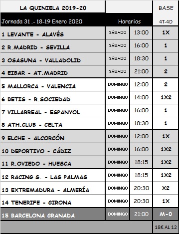 QUNIELA 31 TEMPORADA 19-20; SABADO Y DOMINGO 18 Y 19 ENERO 2020. MIS CONTENIDO