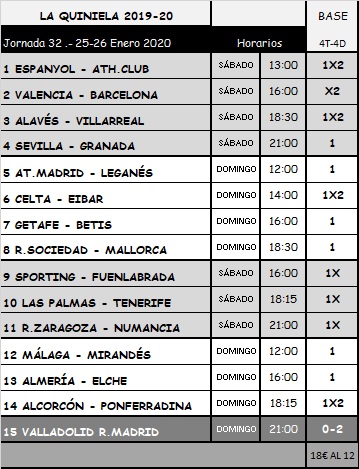QUNIELA 32 TEMPORADA 19-20; SABADO Y DOMINGO 25 Y 26 ENERO 2020.