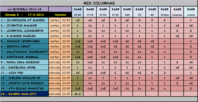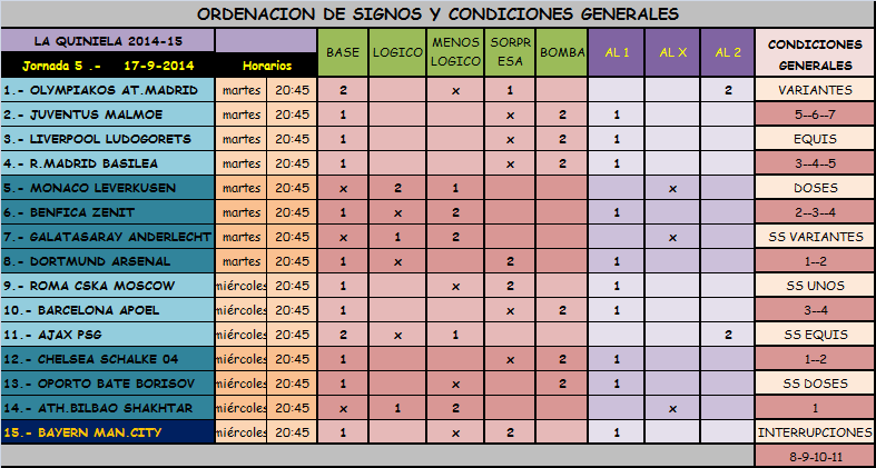 QUINIELA JORNADA 5,CHAMPIONS LEAGUE,MARTES Y MIERCOLES 16 Y 17 SEPTIEMBRE 2014.