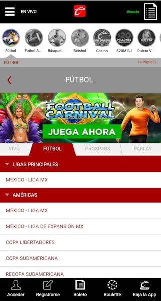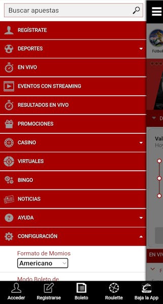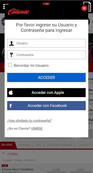 En la app de Caliente se puede encontrar la misma oferta que en el sitio web, con un menú desplegable, donde encontrarás un botón para registrarte, además de seccoines para: