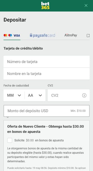 Bet365 acepta pagos en dólares con tarjetas de débito/crédito (Visa y MasterCard), Click to Pay, AstroPay, PaySafeCard y transferencias bancarias internacionales.