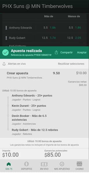 Allí usé el constructor de apuestas para apostar a que Edwards y Durant encestarán más de 25 puntos cada uno, Gobert tomará más de 13 rebotes y Booker repartirá más de siete asistencias en el segundo juego de la serie.