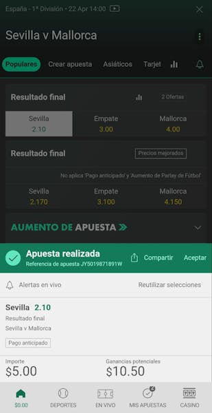 Después, una vez con el dinero en mi cuenta, estudié los partidos más importantes del día y decidí colocar dos apuestas simples en mercados con cuotas de más de 1.20 para así cumplir con los requisitos para recibir el bono.