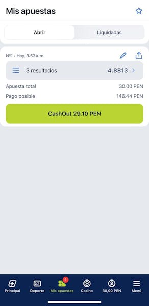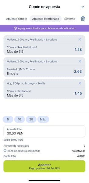 Una vez con el bono en mi saldo y conociendo las condiciones del bono, realicé una apuesta combinada de S/30 a tres eventos de fútbol.