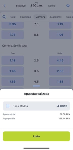 Además, elegí el partido entre Espanyol y Sevilla, para apostar por al menos 4 corners para Sevilla