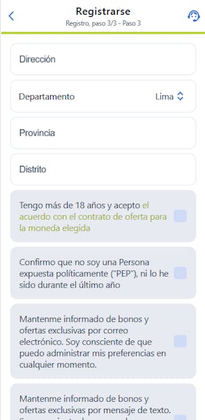 - Una vez que le des clic, deberás colocar tu información como número, correo y una contraseña. Luego, deberás ingresar tu DNI, nombre, apellido, fecha de nacimiento y nacionalidad. Y, finalmente, en el tercer paso, deberás colocar tu dirección, departamento, distrito, provincia, y confirmar tu edad y otras solicitudes de contacto de la casa.