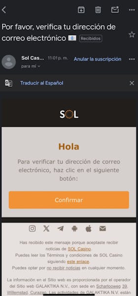 - Verifica tu mail y haz tu primer depósito: El proceso de registro termina con el correo de verificación de tu cuenta. Por lo que deberás ir a tu bandeja de entrada y desde ahí darle clic a “confirmar”. Una vez que lo hagas, verás un menú para ver “saldos”, “depósito” y “retiro. Selecciona depósito, elige un método de pago y deposita mínimo S/50 para acceder al bono de bienvenida Sol Casino.