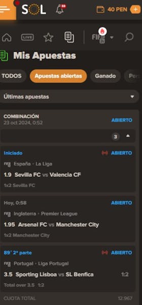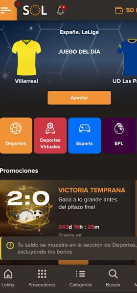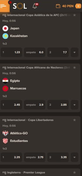⚽ Sol Casino Perú, aunque inicialmente se especializaba en juegos de casino, se ha vuelto una opción muy sólida para apuestas deportivas gracias a una excelente interfaz, variedad de deportes y magnífica atención al cliente.