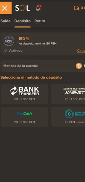 - Métodos de pago: Sol Casino Perú no cuenta con muchos métodos de pago como otras casas de apuestas, pero ofrece lo necesario para no tener problemas recargando o retirando: Transferencias, Kasnet, PayCash y Critomonedas para depósitos, y transferencias bancarias como única opción para retiros.