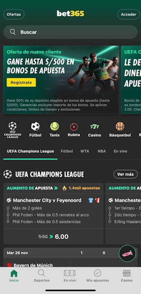 Hasta S/500 en bonos de apuesta para nuevos clientes en bet365. Realice un depósito de S/20 o más y obtendrá el 50% en bonos de apuestas. Solo para clientes nuevos, se aplican condiciones. Las ganancias no incluyen el importe de los bonos de apuesta.
