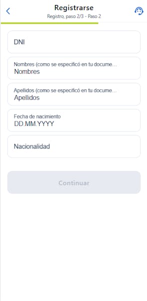 - Luego, como segundo paso, deberás ingresar tu DNI, nombre, apellido, fecha de nacimiento y nacionalidad