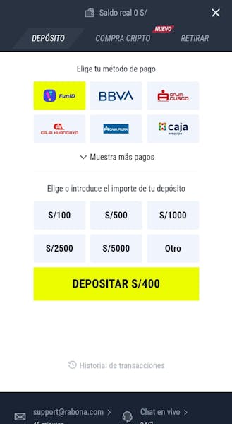 ✅ Mi experiencia: todos esos métodos de pago son muy seguros y prácticos de usar, pero mi favorito para usar en una casa de apuestas siempre es PagoEfectivo, ya que es superfácil de usar y puedo usar Yape. Así que mi emoción fue enorme al ver que estaba disponible en Rabona; gracias a ello, mi proceso de depósito fue A1 como siempre.