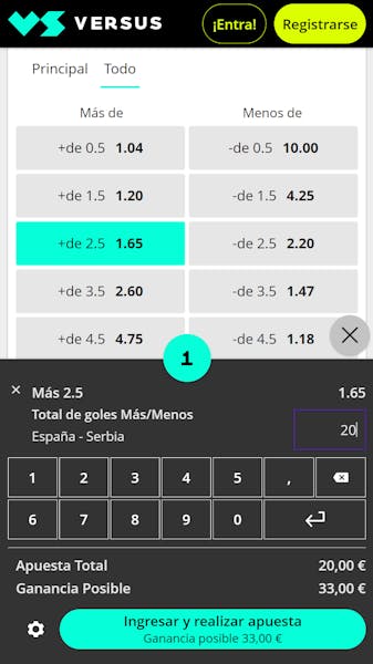 Para comenzar a apostar en Versus, primero elegí un evento que me interesaba (en este caso España - Serbia de la Liga de Naciones de la UEFA) ya fuera antes de que comenzara o en directo. Luego, hice clic en la cuota deseada, que se marcó en verde. Esta selección se añadió al boleto en la barra de la derecha, donde introduje el importe de 20 euros y presioné el botón verde "Realizar Apuesta". Así de simple.